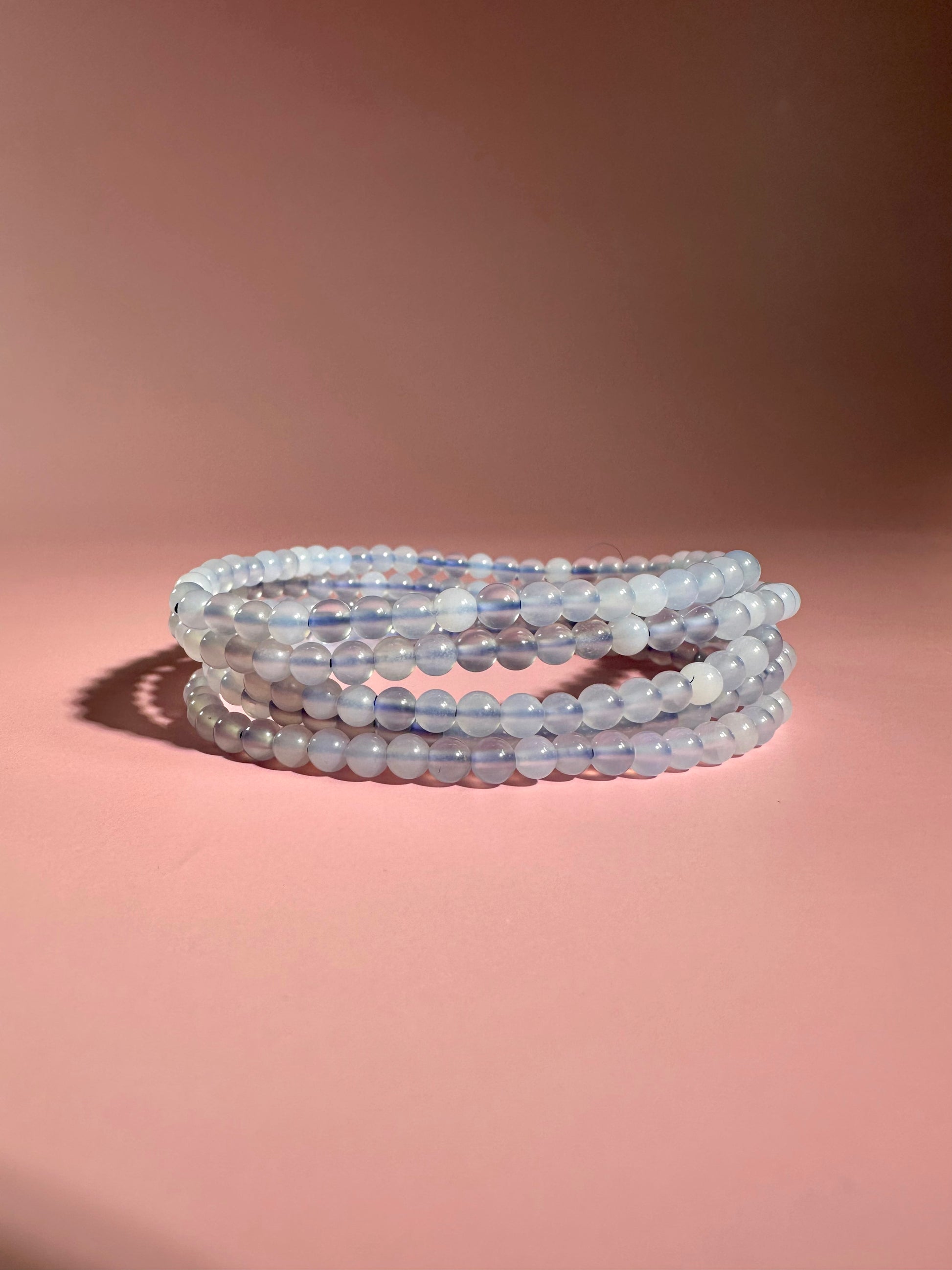 You will receive 1 intuitively chosen 4mm Blue Chalcedony Beaded Bracelet. Delicate blue tones make this perfect for everyday wear.