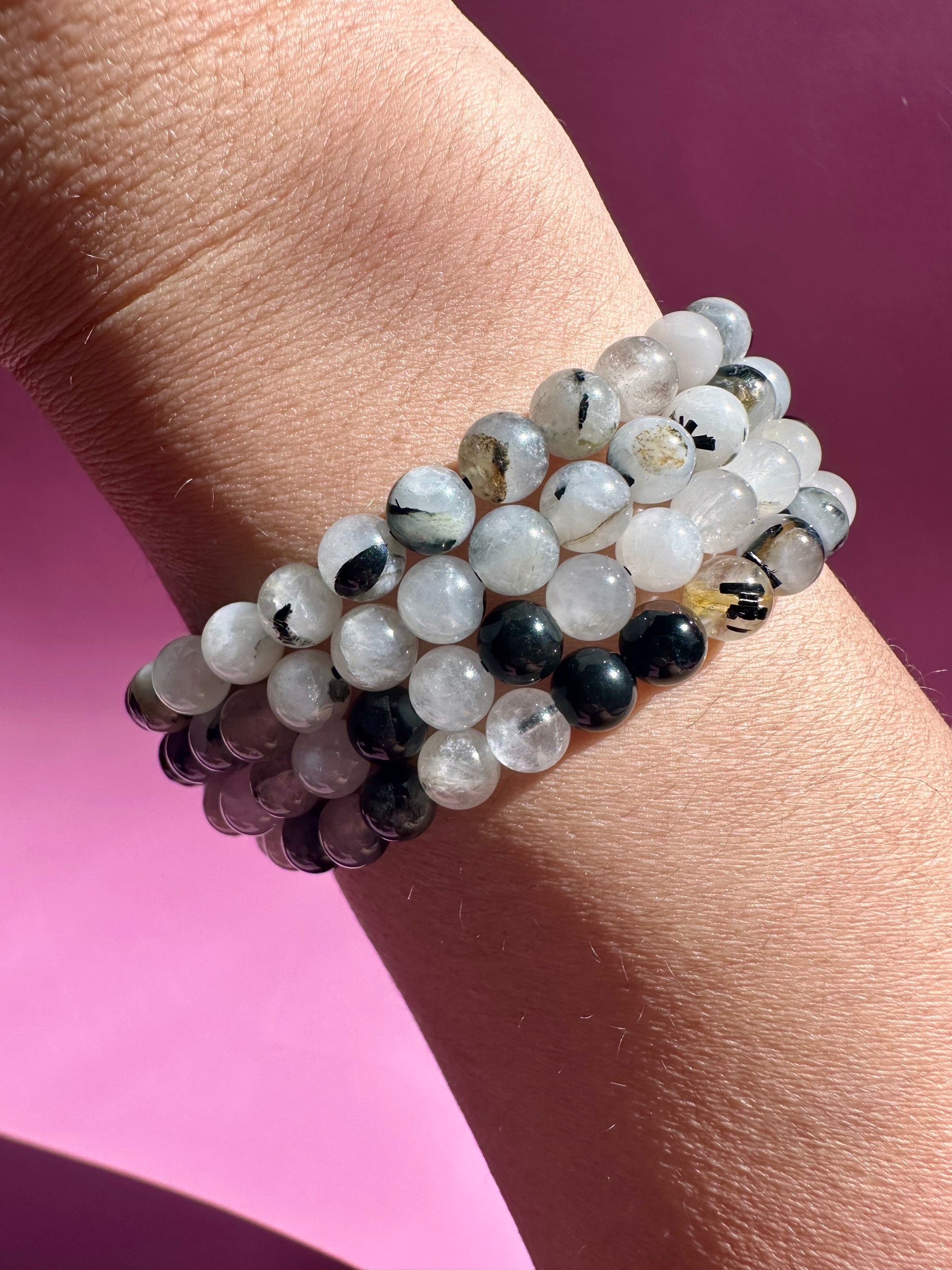 Each bead combines protective Black Tourmaline with amplifying Clear Quartz, supporting protection, grounding, and energy balance. Stretchable design fits most wrists, perfect for daily wear, stacking, or gifting.