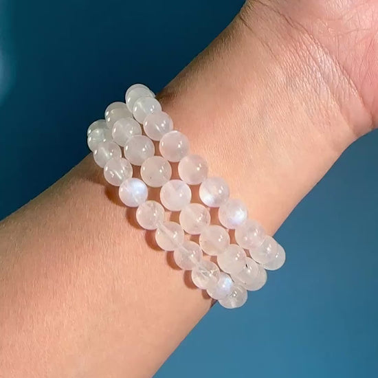 You will receive 1 intuitively chosen 8mm HQ Moonstone Beaded Bracelet. Soft blue banding creates a soothing visual flow.