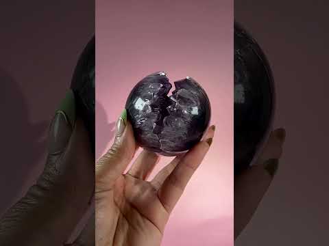 This unique sphere features a natural geode opening that forms a soft “smile” shape, revealing sparkling amethyst crystal points within. The contrast between the smooth polished exterior and the shimmering interior creates a piece that feels both grounding and radiant.