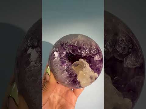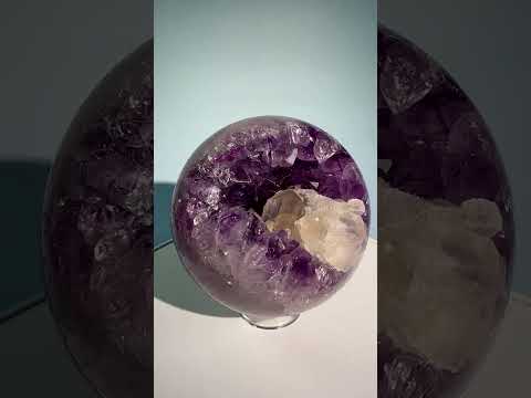 This stunning sphere features a natural geode opening filled with deep purple amethyst crystals, accented by calcite inclusions that add contrast and visual interest. The combination of minerals creates a dynamic and energetically layered piece.