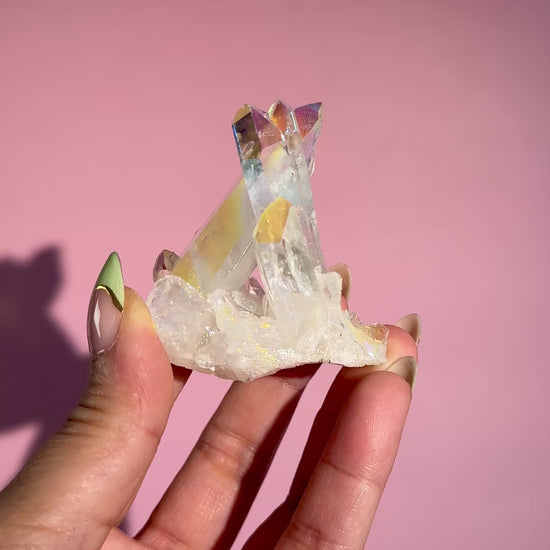 Angel Aura Quartz is known for its uplifting, high-vibrational energy that encourages joy and emotional lightness.