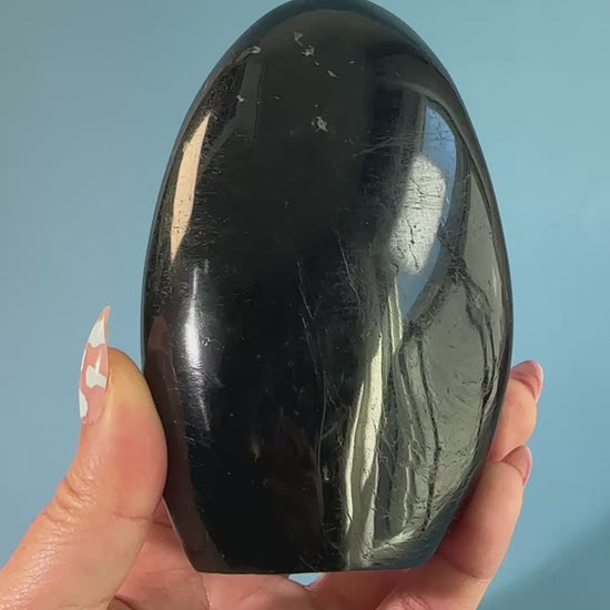 Polished to a smooth, lustrous finish, this Black Tourmaline freeform stands beautifully on its own, showcasing deep black tones and natural character. Its upright form makes it a striking statement piece for crystal displays, desks, or shelves while radiating steady, grounding energy.