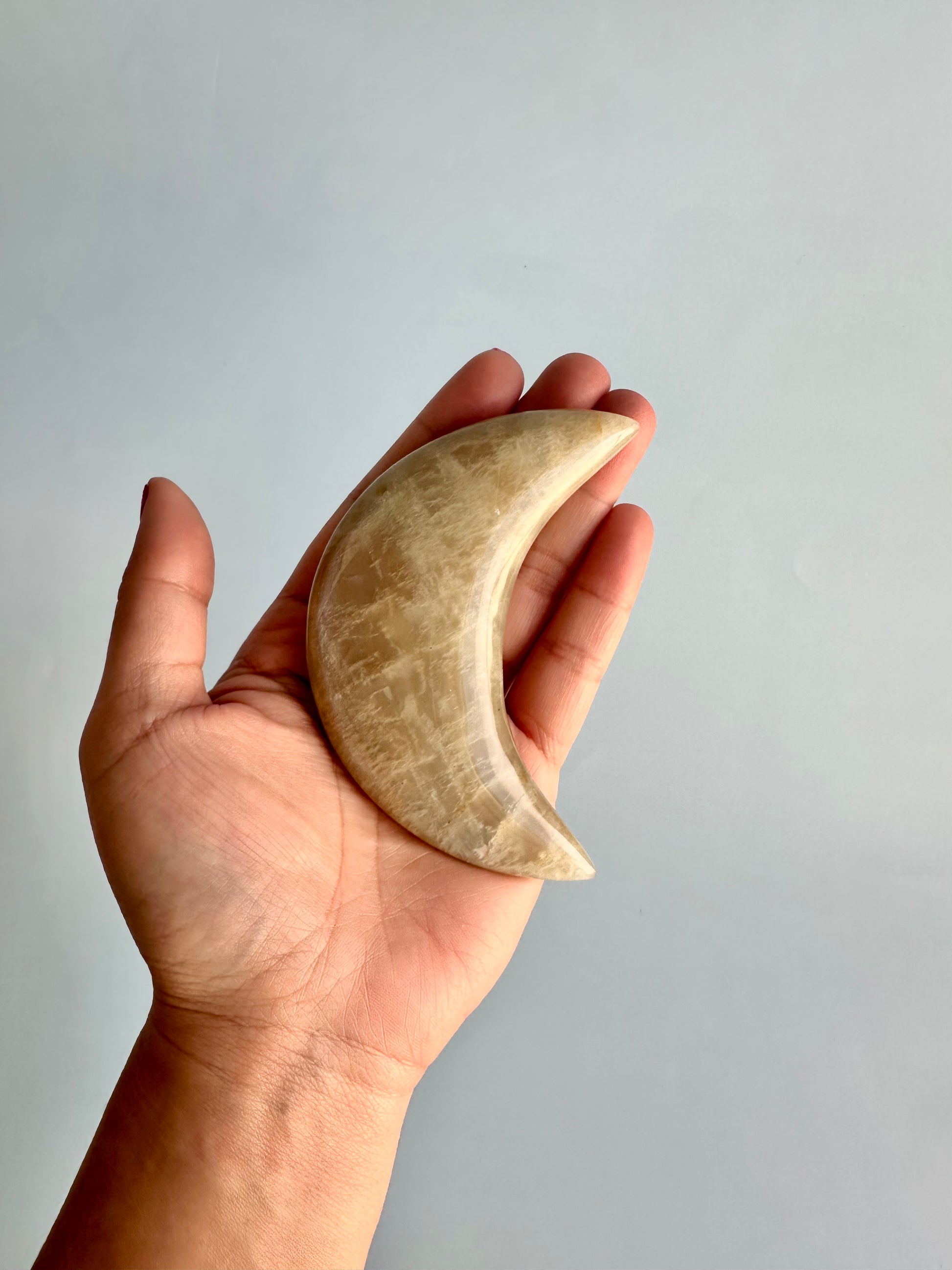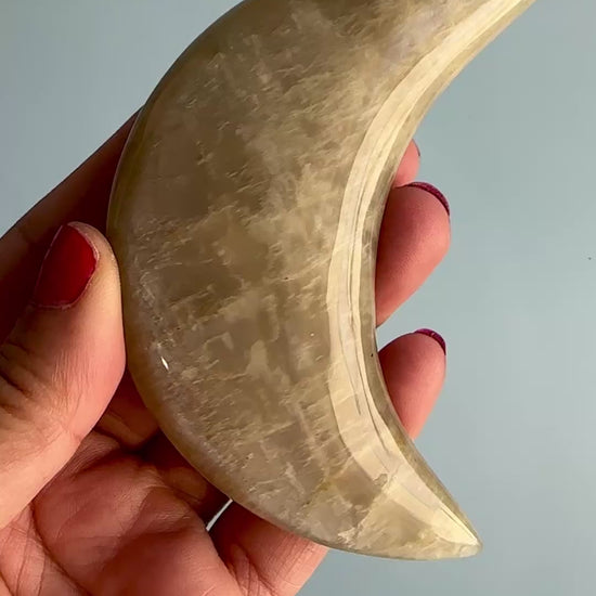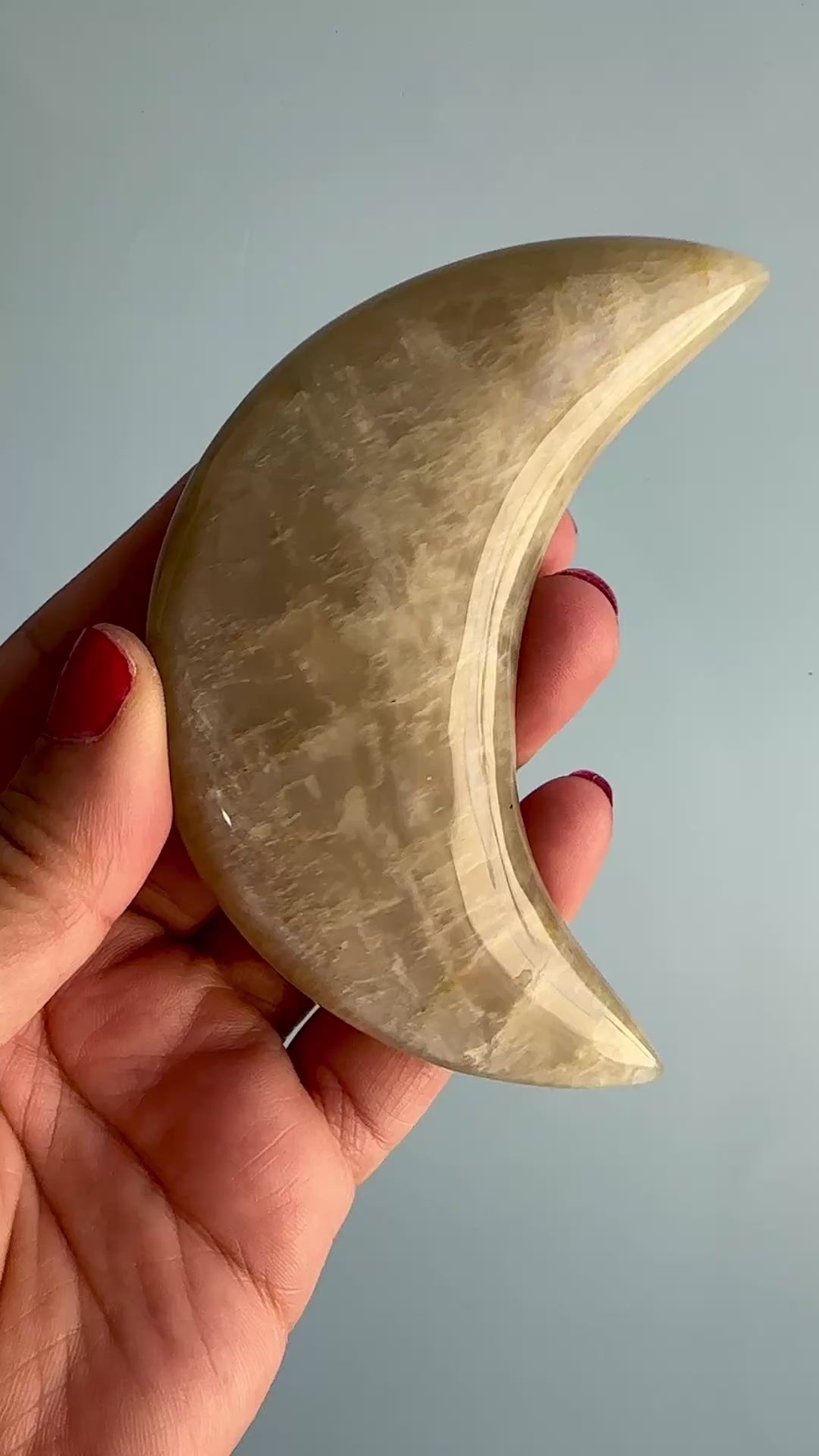 Moonstone embodies divine feminine energy, intuition, and emotional renewal. Connected to lunar cycles, it encourages reflection, calm, and personal growth. Its radiant sheen reminds us to trust our inner guidance and embrace transformation with grace and balance. The crescent-moon shape amplifies its connection to the moon, symbolizing rebirth, intention-setting, and new beginnings.