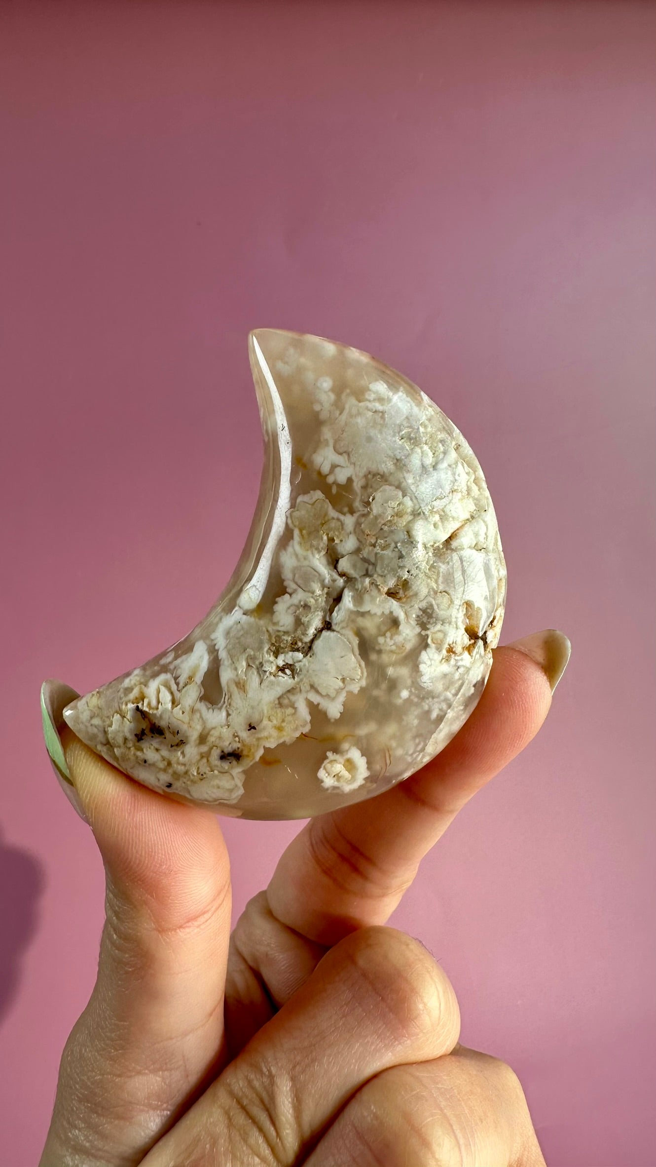 Flower Agate supports confidence and forward movement, while the moon shape encourages reflection and intuitive flow.