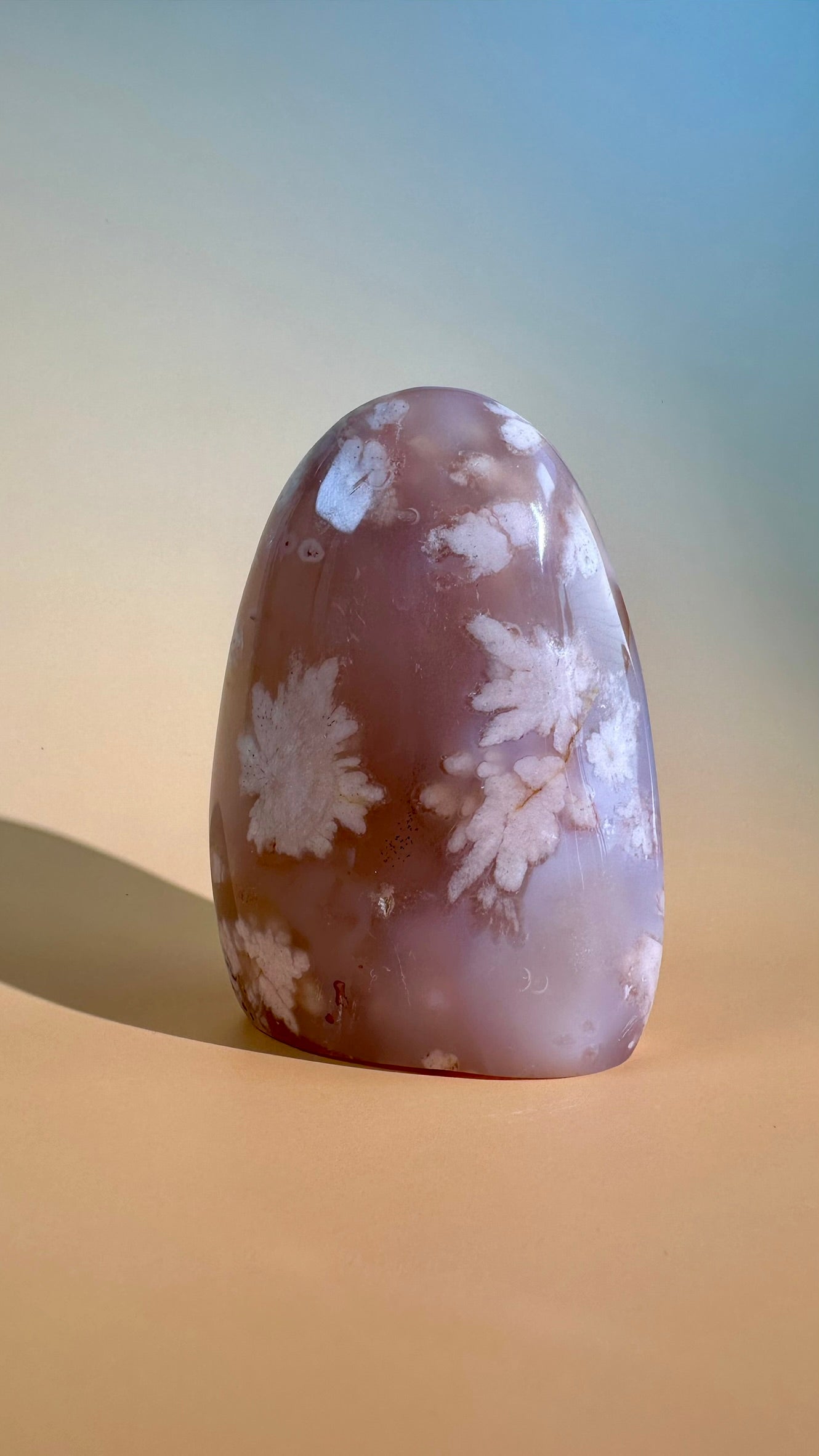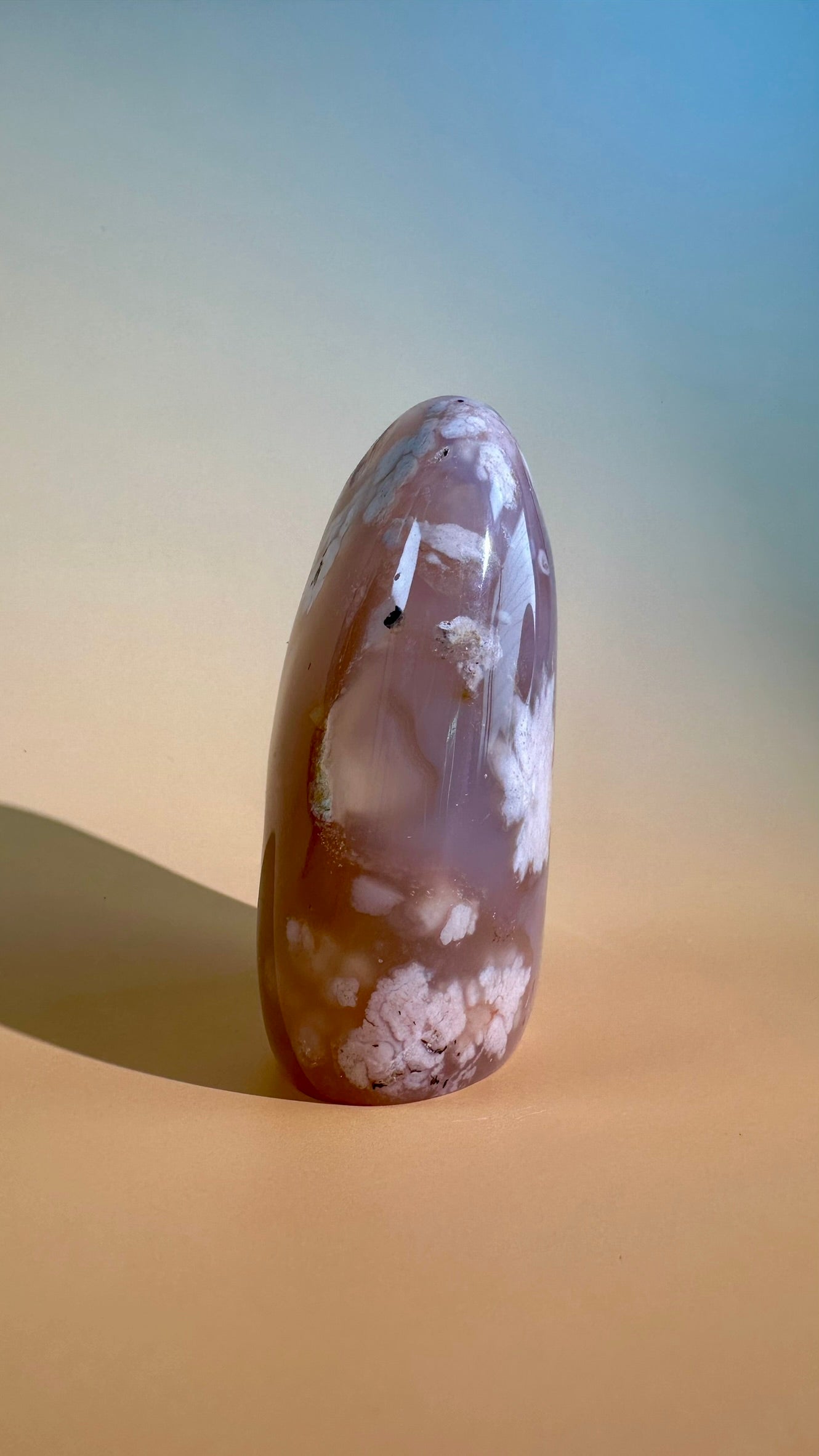 This piece features softer tones with subtle inclusions, offering a calm and nurturing presence.