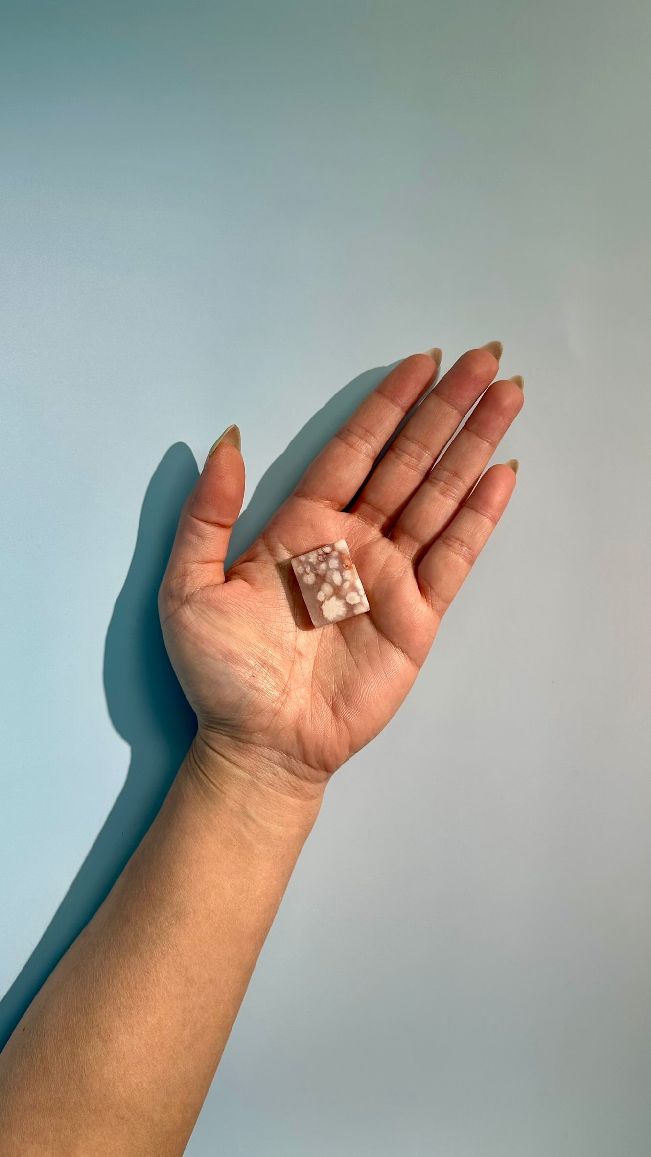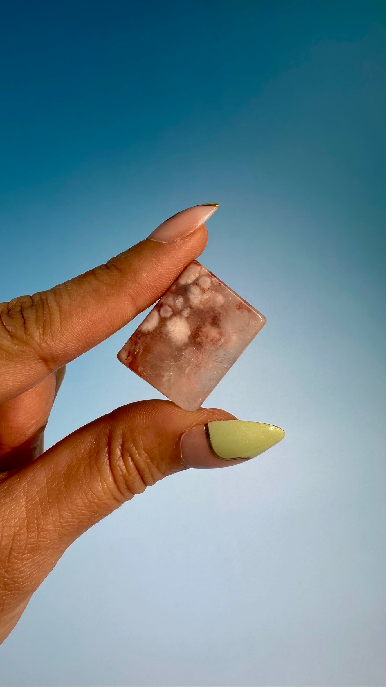 This piece features more defined floral inclusions with slightly richer tones, giving it a stronger and more energizing presence.