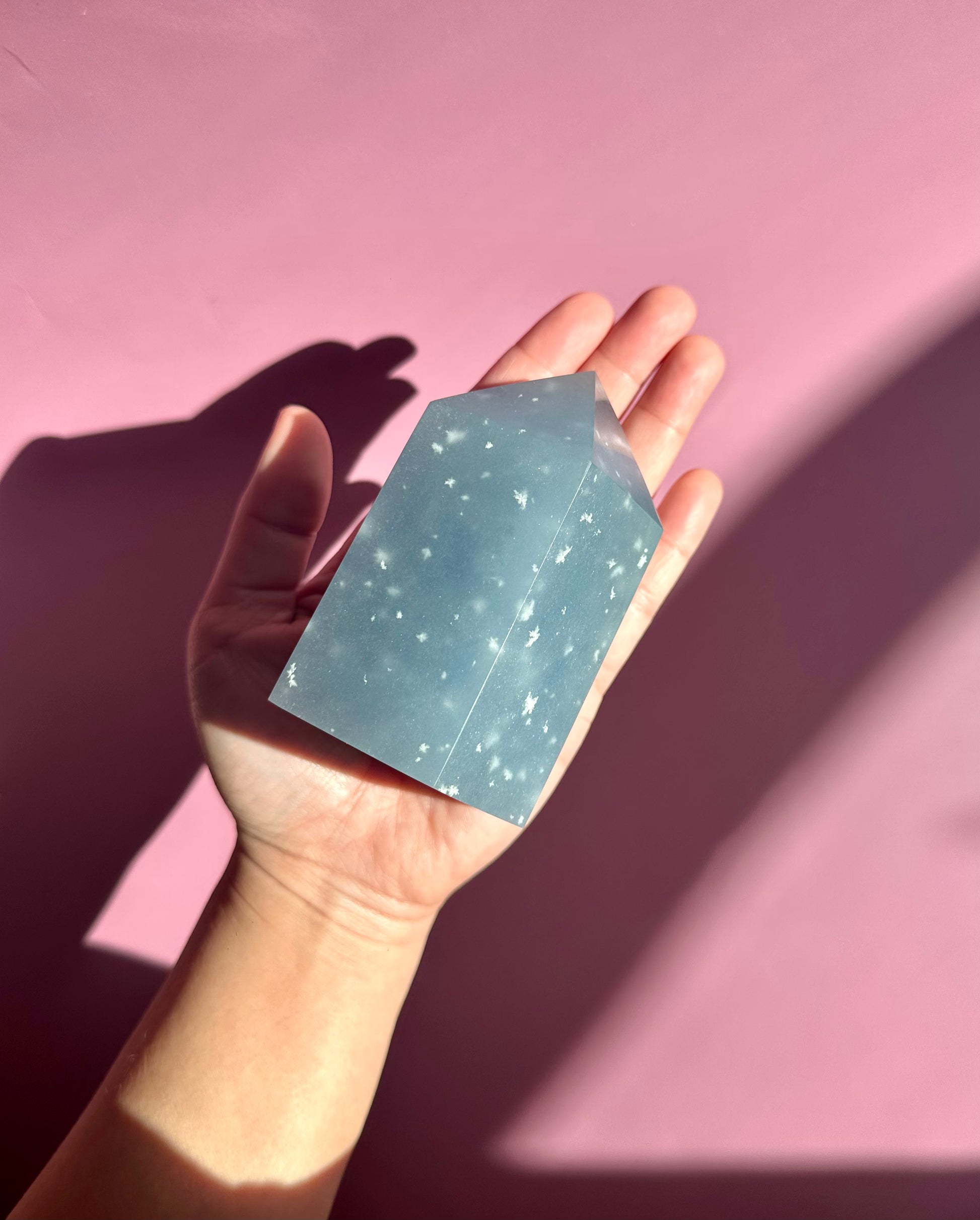 This tower showcases the natural beauty of Peruvian Snowflake Angelite, featuring calming blue tones with white speckles. Angelite is known for promoting peace, emotional clarity, communication, and angelic guidance. The tower shape directs energy upward, making it ideal for display, meditation spaces, or crystal grids.