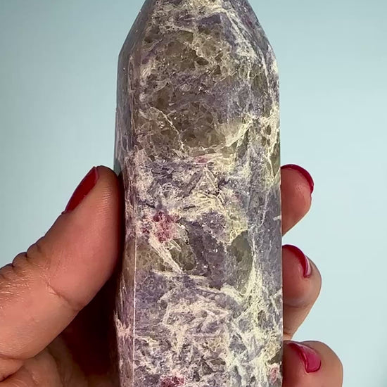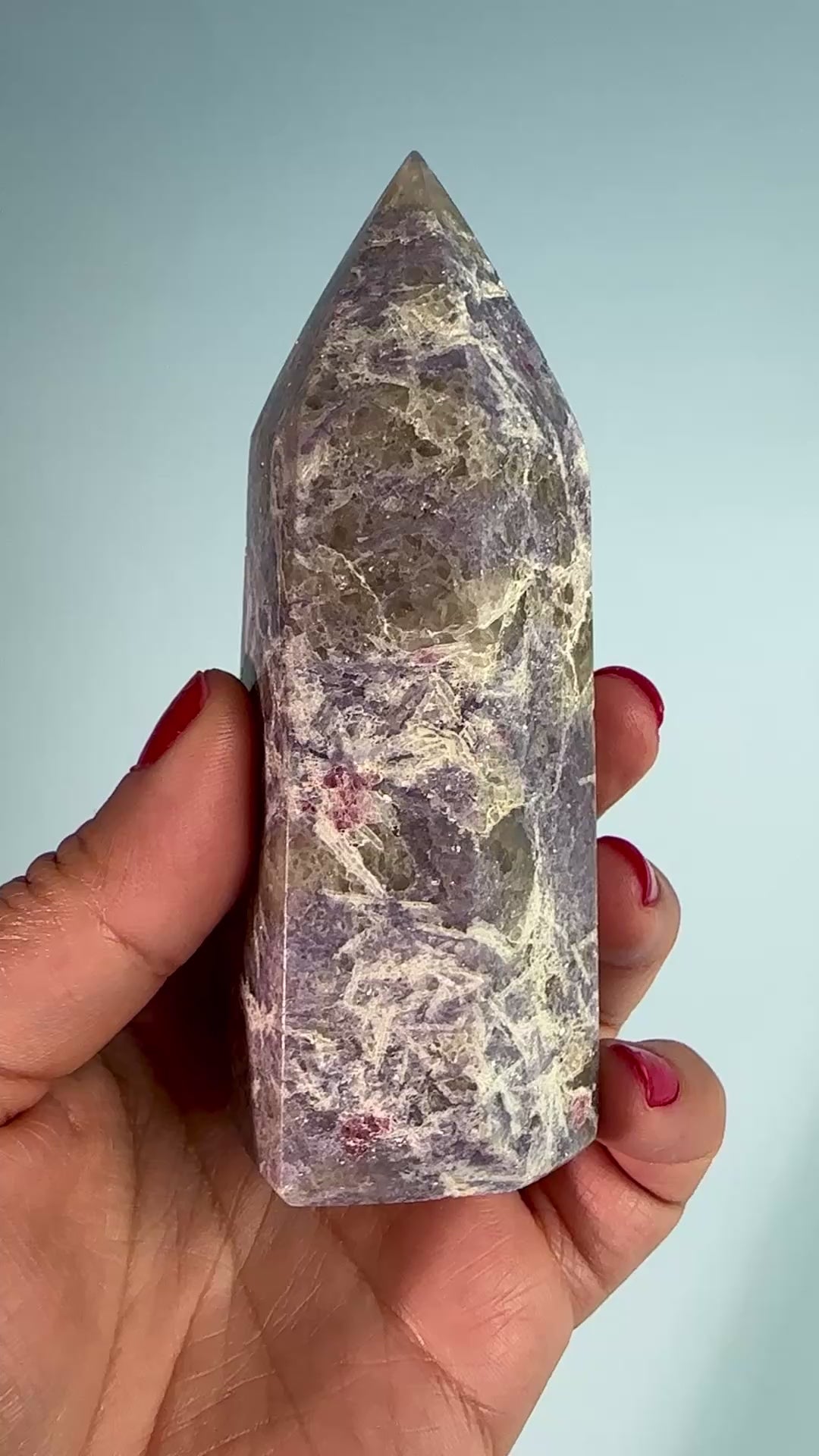 Polished into a radiant point, this Lepidolite tower channels calm energy upward, promoting inner balance and peace. Known for easing anxiety and emotional turbulence, it helps align your mind and heart.