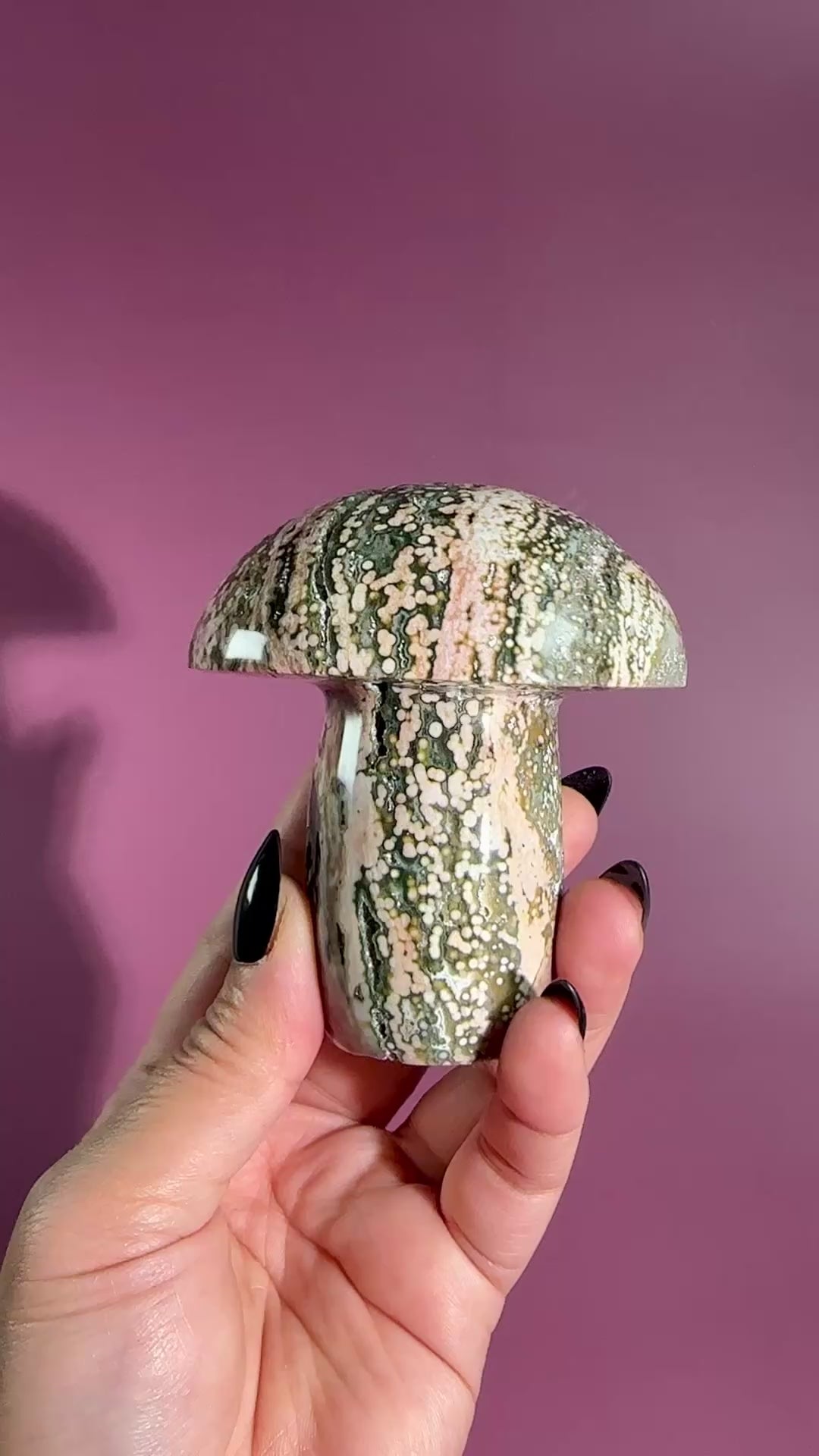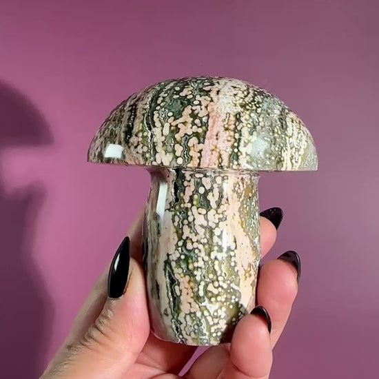 This Ocean Jasper mushroom is adorned with beautiful pink and green orb patterns, polished to highlight its joyful, playful energy. The mushroom carving symbolizes growth and renewal, while Ocean Jasper’s signature orbs create a visually captivating piece.
