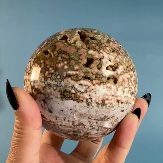 You will receive the exact Ocean Jasper Sphere – Option A. This polished sphere features unique ocean-like patterns and soft earthy tones.