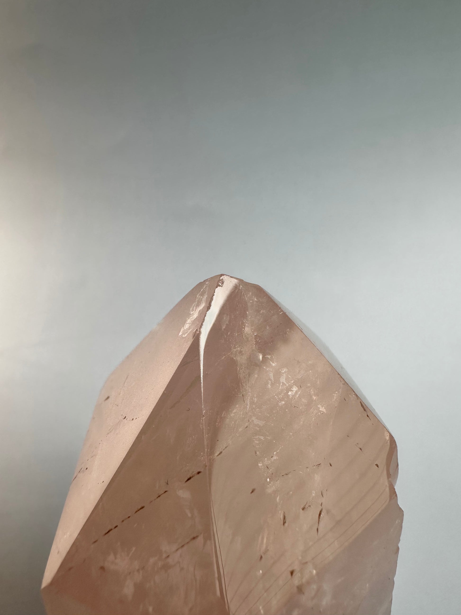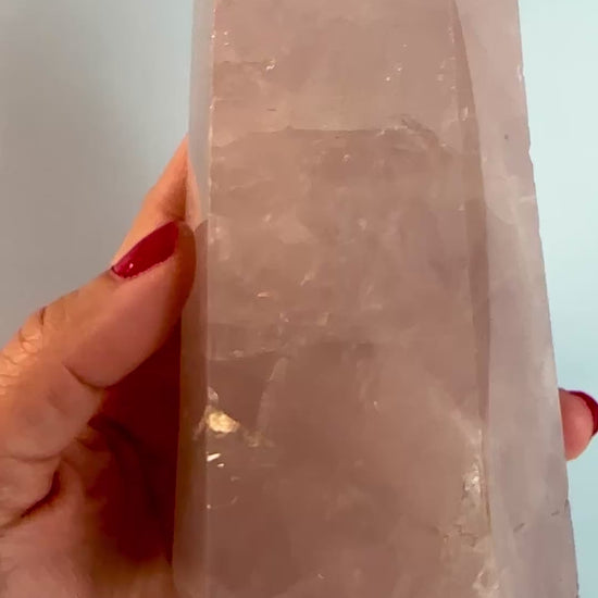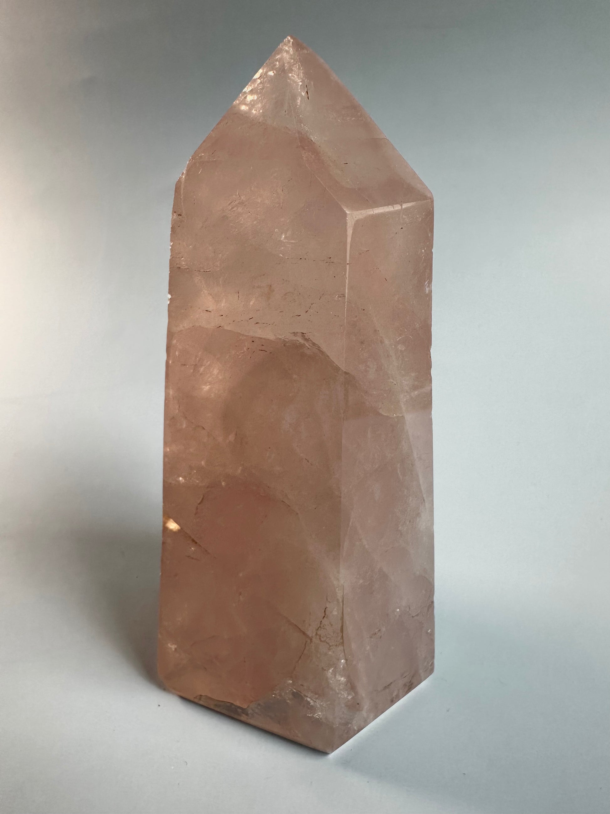 This tower features cloudy inclusions and a natural surface groove, symbolic of resilience through imperfection. The soft pink tones of Rose Quartz remind us to embrace gentleness, self-love, and emotional restoration.