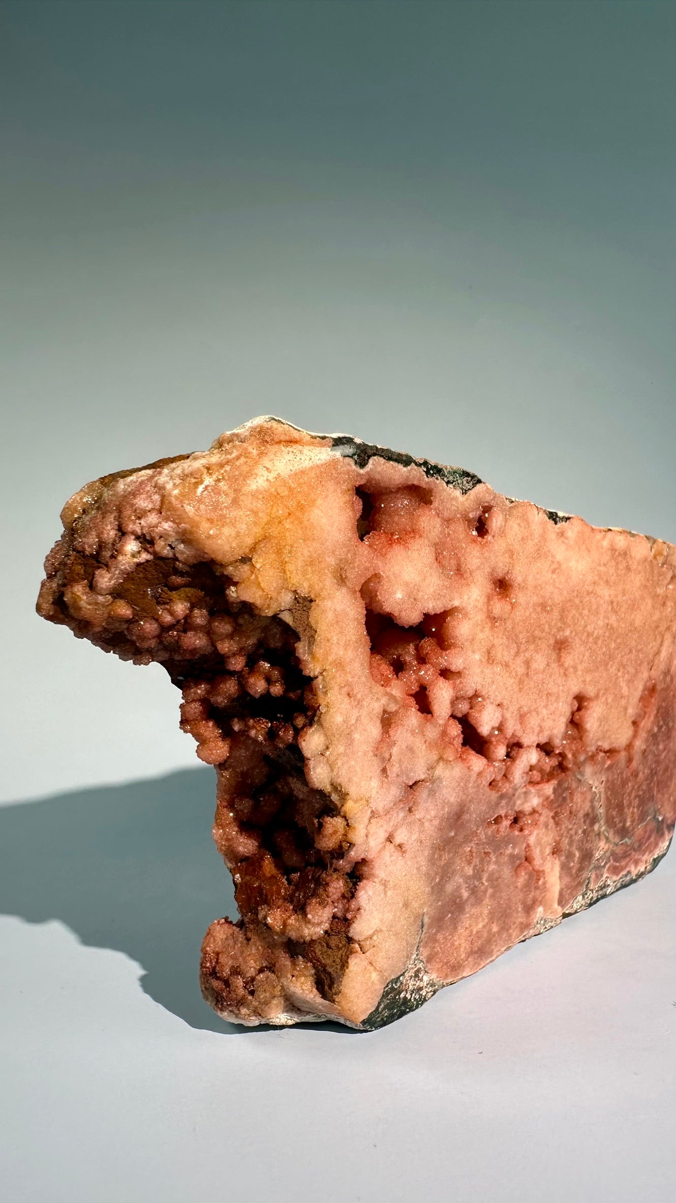 This stunning self-standing slab features rich blush-pink tones with natural crystalline sparkle, allowing it to stand upright on its own without a stand. Its vertical display creates a stronger visual and energetic presence—making it a true statement piece for any space.
