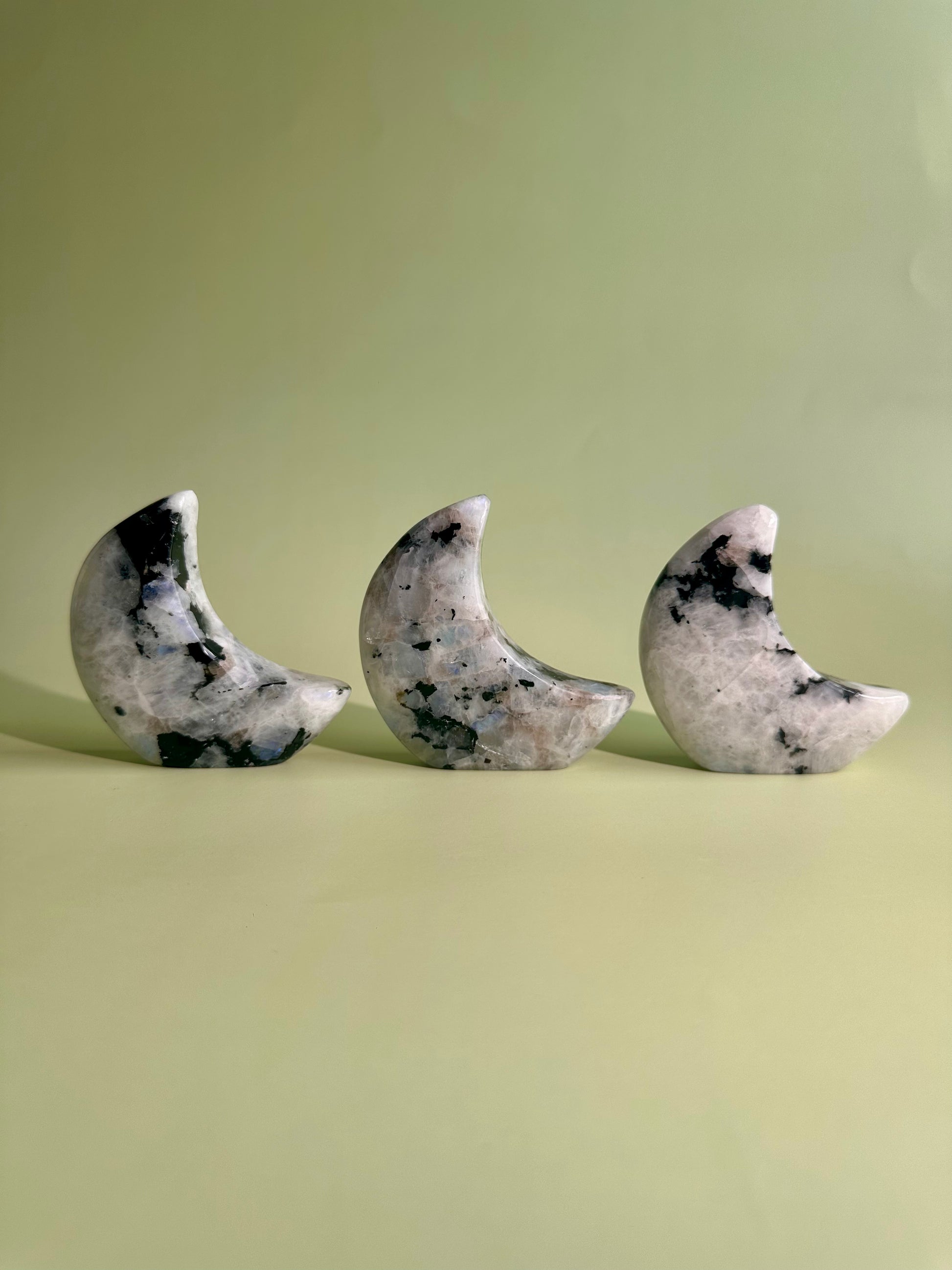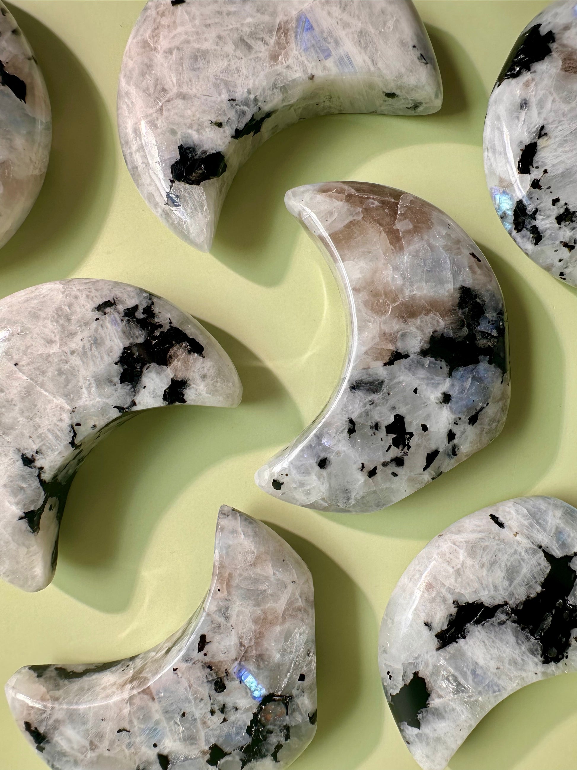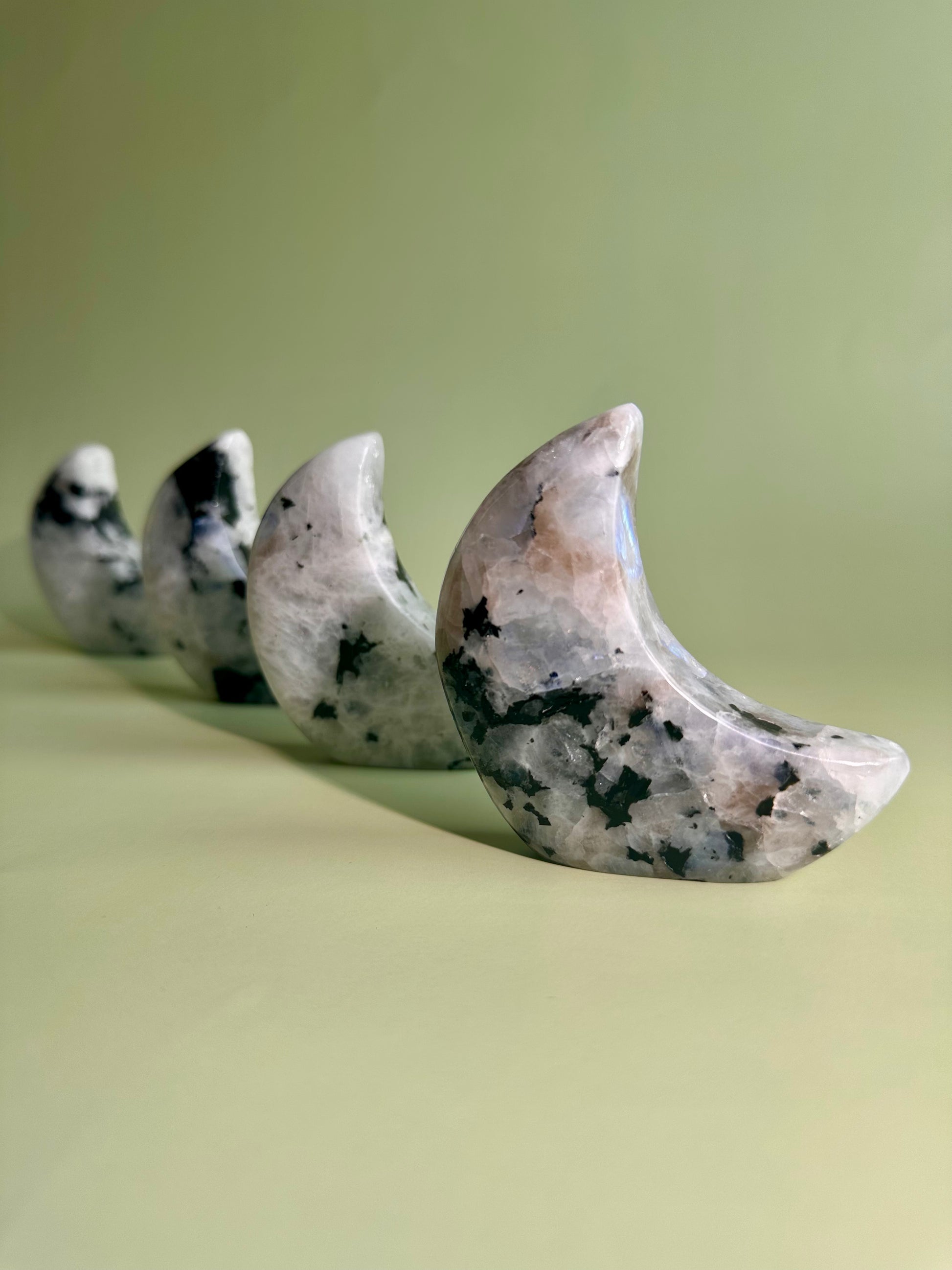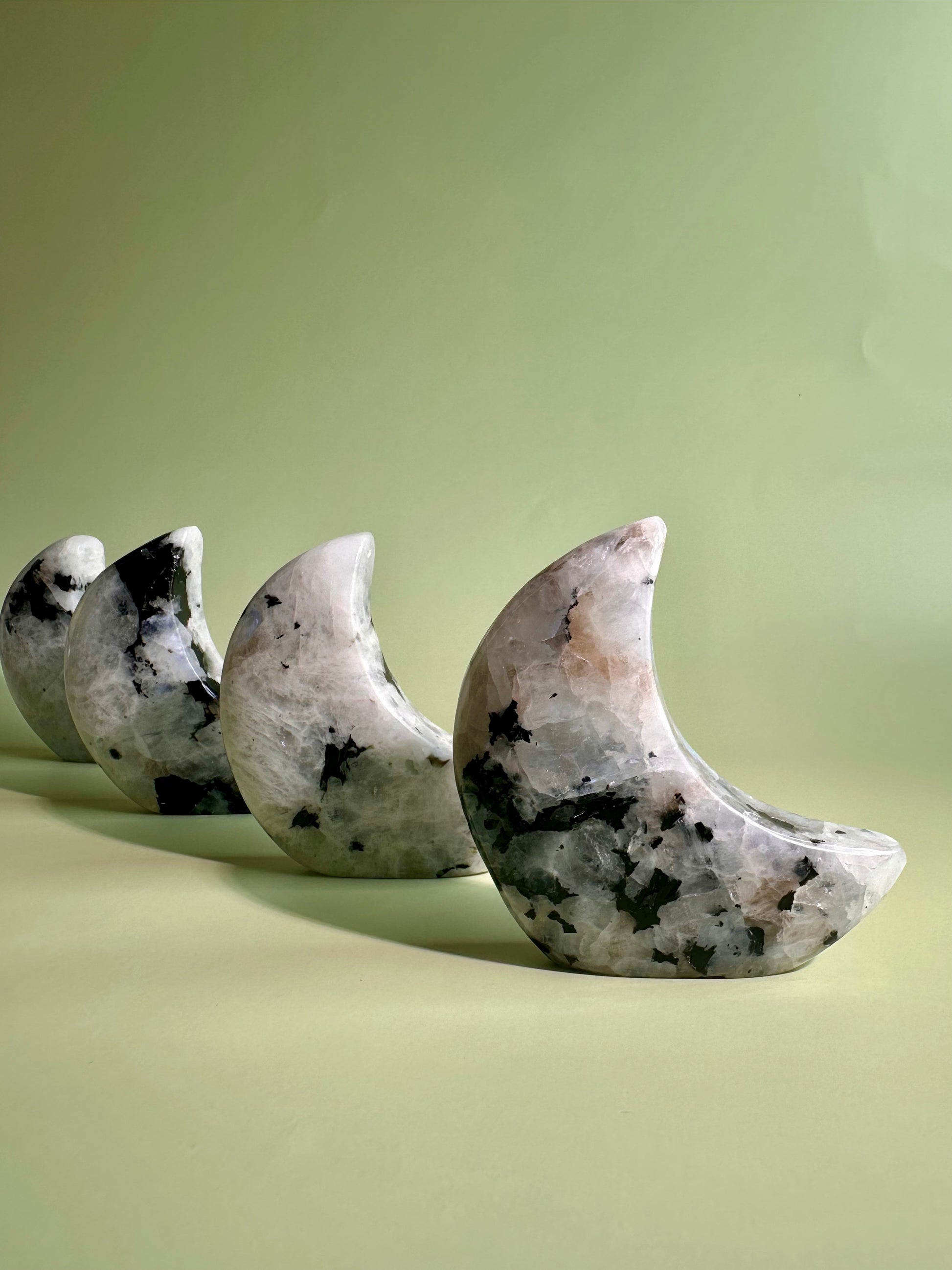 You will receive 1 intuitively chosen Rainbow Moonstone Standing Moon Carving.