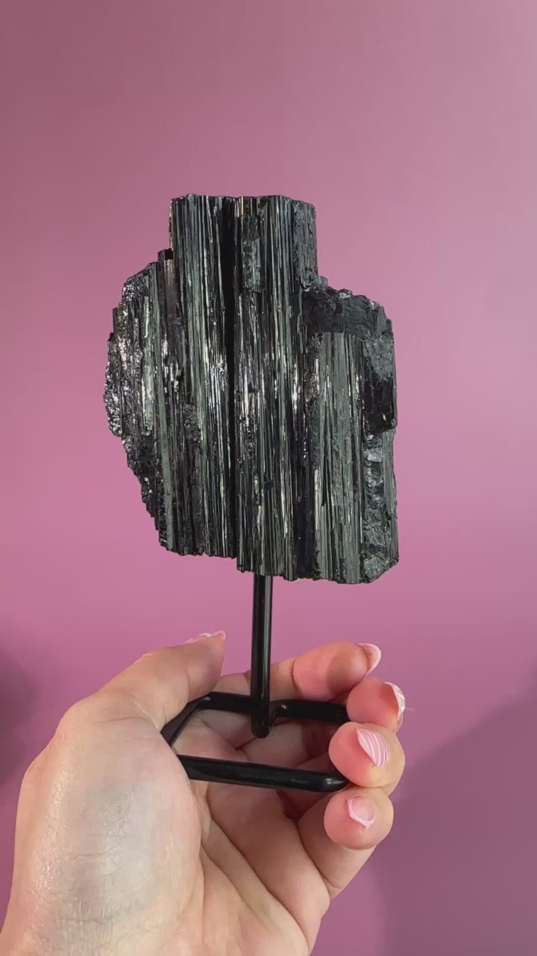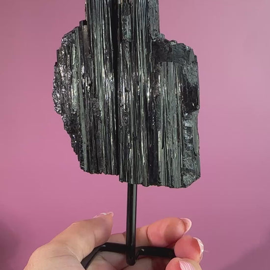 This raw Black Tourmaline specimen is beautifully elevated on a pinned stand, highlighting its natural edges, striations, and rugged beauty. Each piece is one-of-a-kind, making it a powerful yet elegant addition to your crystal collection or décor.