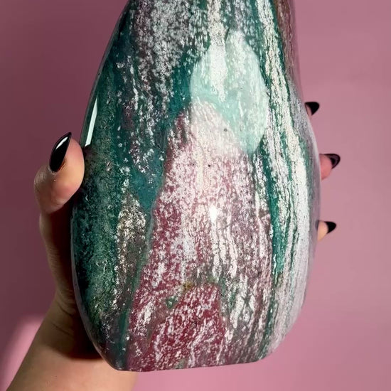 This exceptional Sea Jasper freeform is a true statement piece, showcasing a stunning blend of purple, green, white, and red hues in sweeping, organic patterns. Polished to reveal its natural artistry, this large freeform commands attention while radiating a calming, grounded presence.