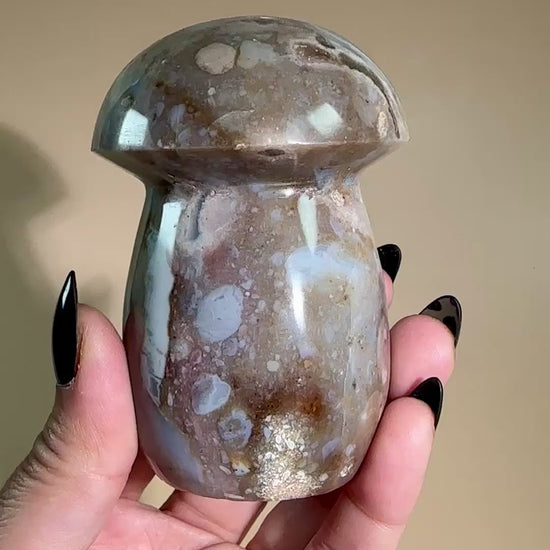 Carved into a charming mushroom shape, this Sea Jasper piece showcases soft, ocean-inspired patterns with earthy hues. The mushroom form symbolizes growth, grounding, and connection to nature, making this a peaceful and nurturing addition to any crystal collection.