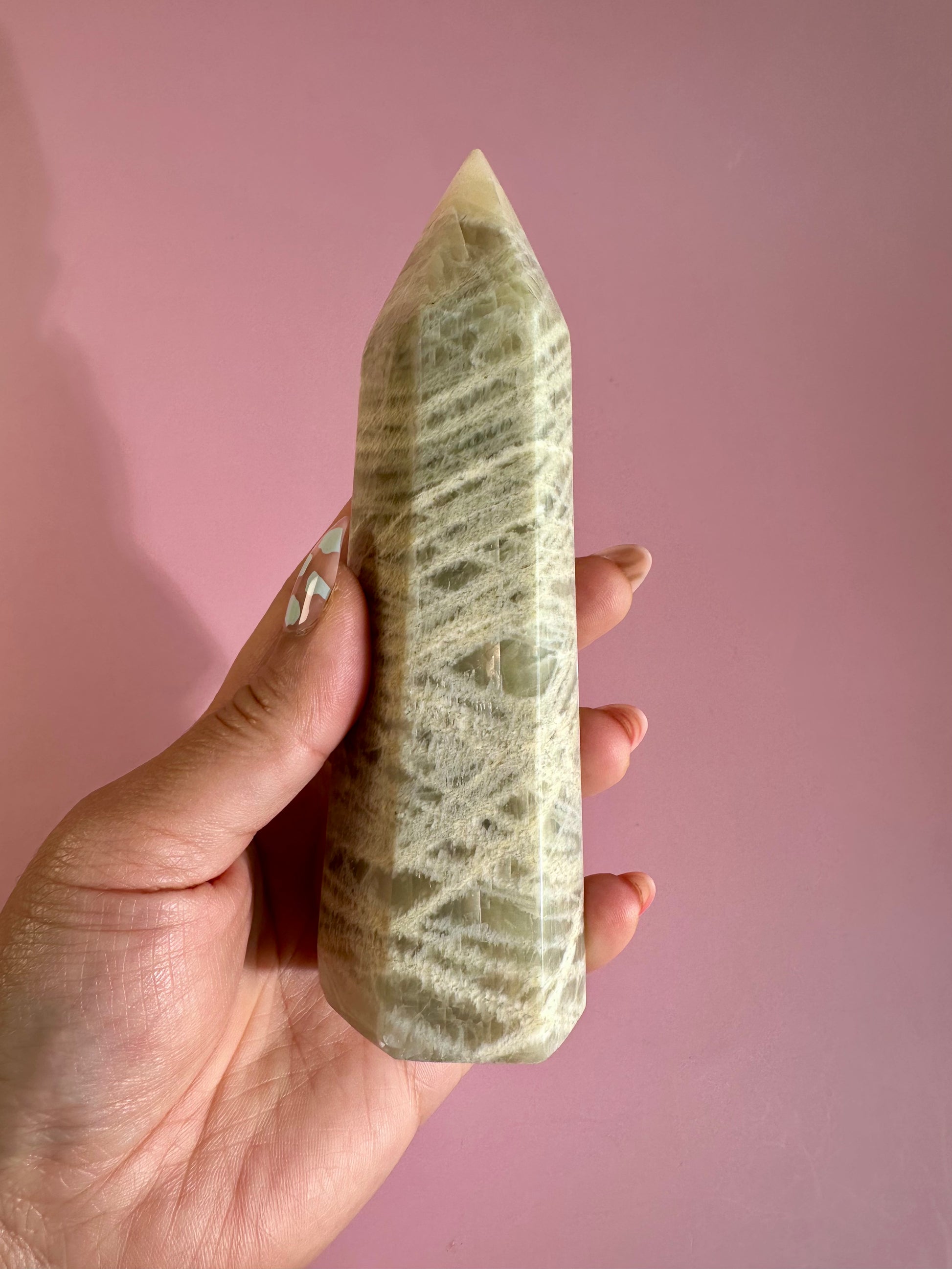 Polished into a classic tower shape, this Moonstone piece channels energy upward while showcasing soft tones and natural flashes unique to the stone. Elegant and grounding, this tower stands beautifully on its own as a statement crystal.