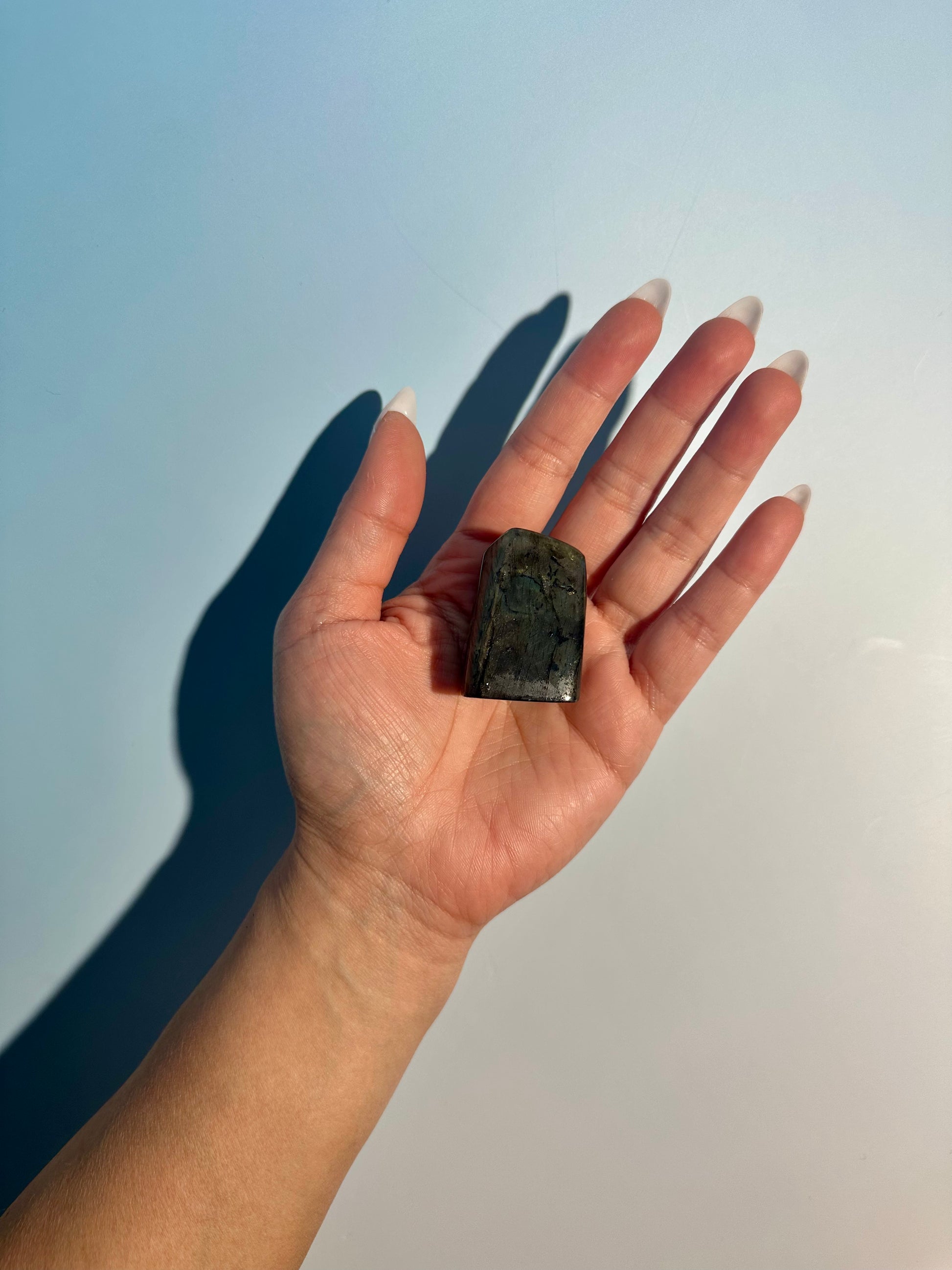 This freeform features soft, shifting flashes of blue and hints of gold that appear as light moves across its surface. Its compact, self-standing form makes it a perfect everyday piece that brings subtle magic and protection into your space.