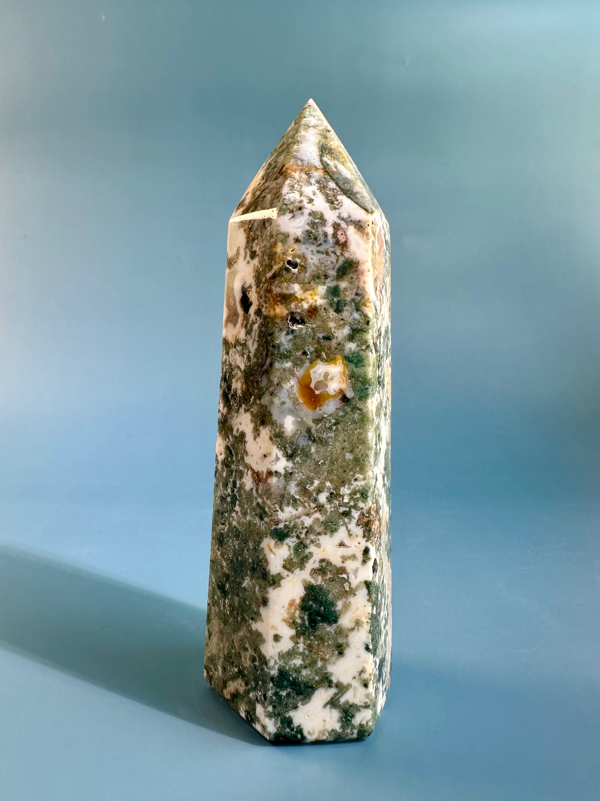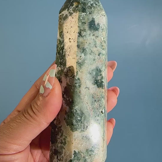 This polished Tree Agate tower features soft white tones with delicate green veining, creating a tranquil, earthy aesthetic. Each tower is naturally unique, with gentle patterns that reflect stillness and balance.
